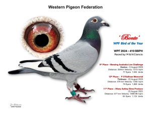 What a season! This year’s Bird of the Year has given us not just a champion, but a story that’s sure to make every fancier smile. Let’s take a look at the journey of Matt Ciancio and his beautiful blue bar pied hen, WPF-24-410 a pigeon who’s not just fast, but full of heart.