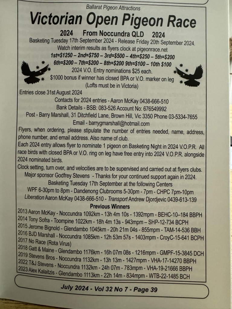 Basketing: VICTORIA OPEN PIGEON RACE [Noccundra].